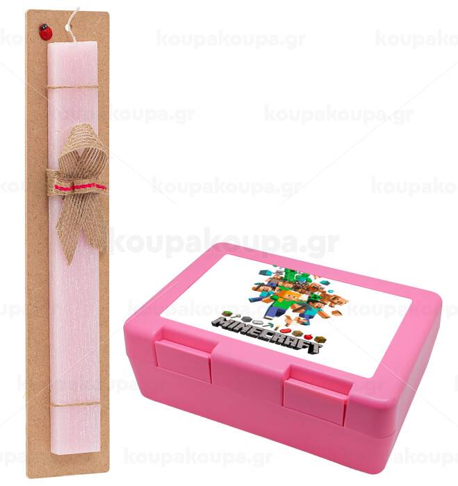 Minecraft adventure, Easter Set, children's snack container PINK & scented flat Easter candle (30cm) (PINK)