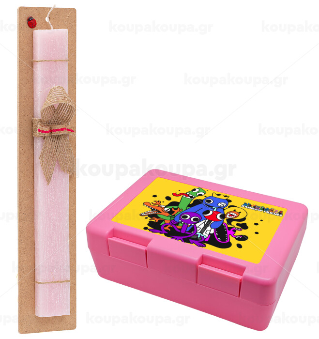 Rainbow friends, Easter Set, children's snack container PINK & scented flat Easter candle (30cm) (PINK)