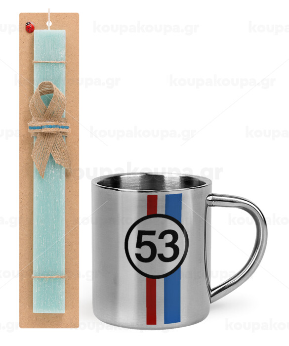 VW Herbie 53, Easter Set, metallic thermal cup (300ml) & aromatic flat Easter candle (30cm) (TURQUOISE)