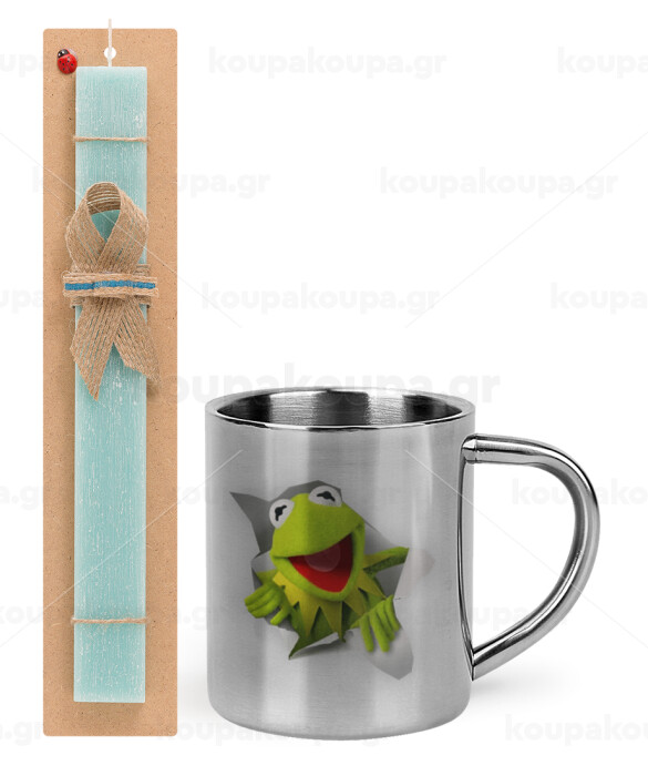 Kermit the frog, Easter Set, metallic thermal cup (300ml) & aromatic flat Easter candle (30cm) (TURQUOISE)