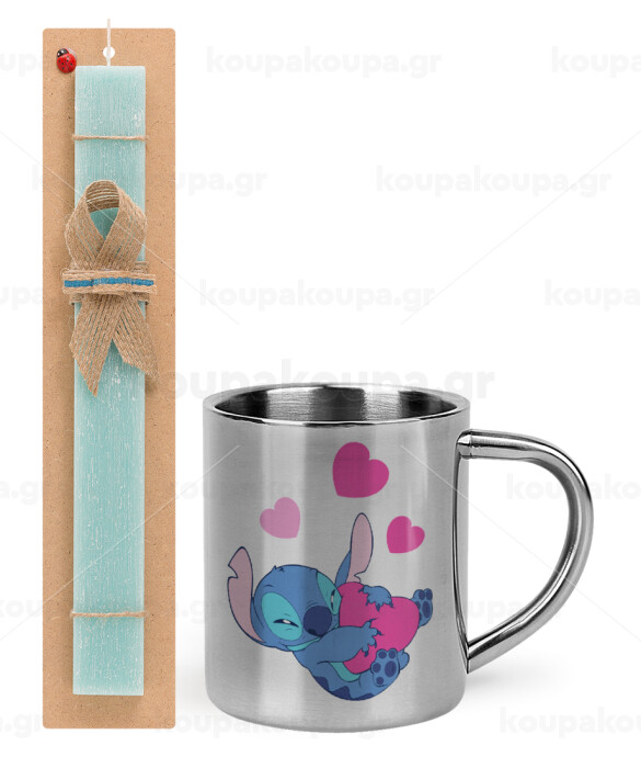 Lilo & Stitch hugs and hearts, Easter Set, metallic thermal cup (300ml) & aromatic flat Easter candle (30cm) (TURQUOISE)