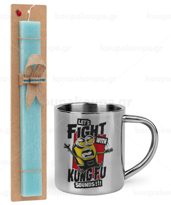 Minions Let's fight with kung fu sounds, Easter Set, metallic thermal cup (300ml) & aromatic flat Easter candle (30cm) (TURQUOISE)