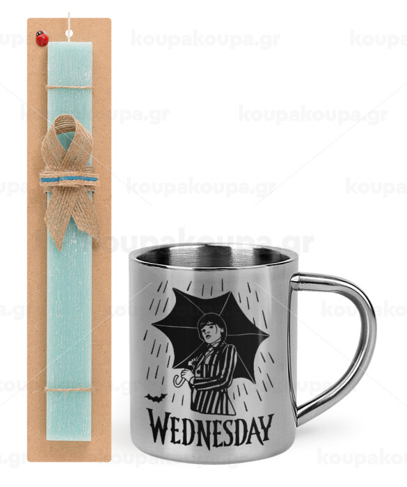 Wednesday Addams, Easter Set, metallic thermal cup (300ml) & aromatic flat Easter candle (30cm) (TURQUOISE)