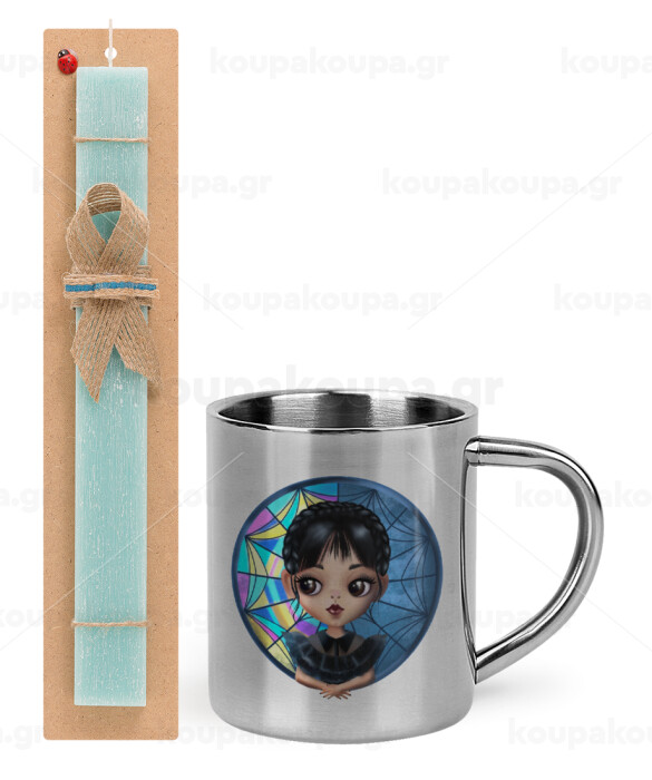 Wednesday big eyes, Easter Set, metallic thermal cup (300ml) & aromatic flat Easter candle (30cm) (TURQUOISE)