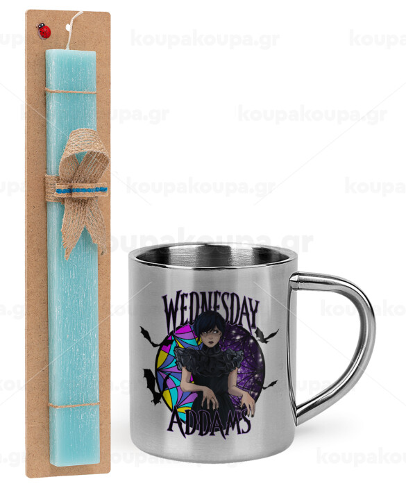 Wednesday Jenna Ortega, Easter Set, metallic thermal cup (300ml) & aromatic flat Easter candle (30cm) (TURQUOISE)