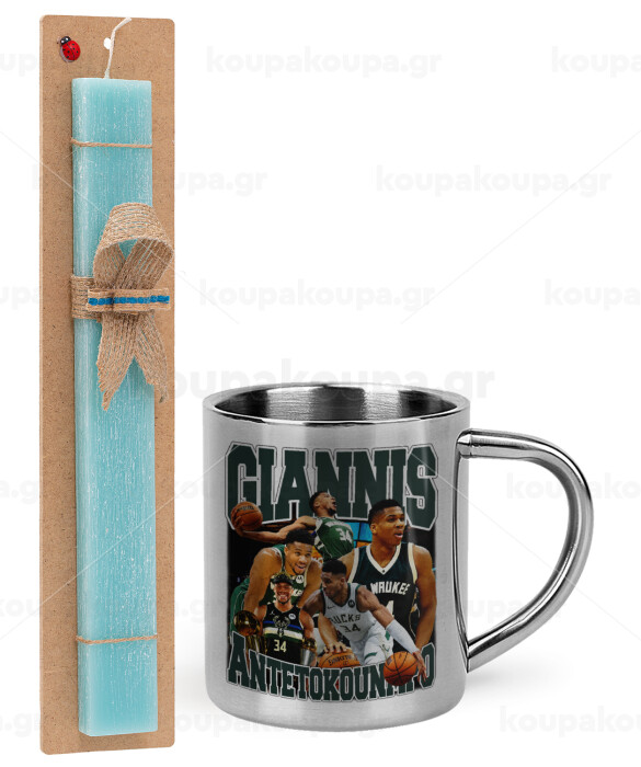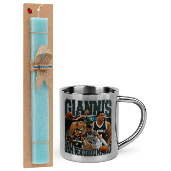 Giannis Antetokounmpo, Easter Set, metallic thermal cup (300ml) & aromatic flat Easter candle (30cm) (TURQUOISE)