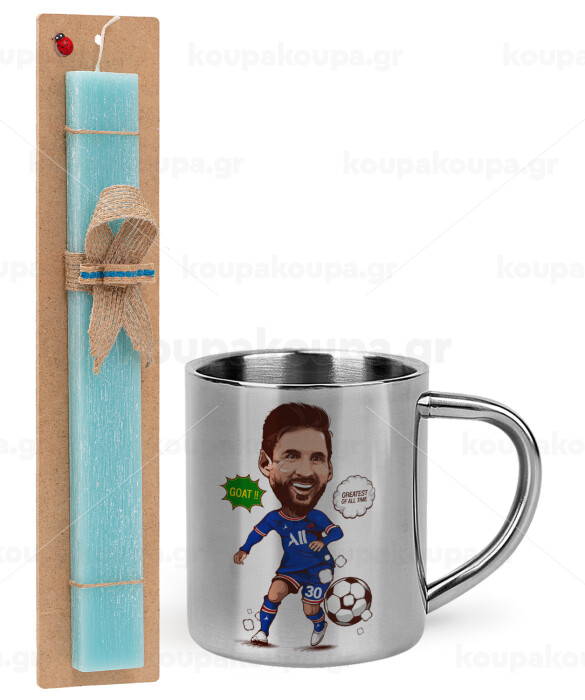 Lionel Messi drawing, Easter Set, metallic thermal cup (300ml) & aromatic flat Easter candle (30cm) (TURQUOISE)