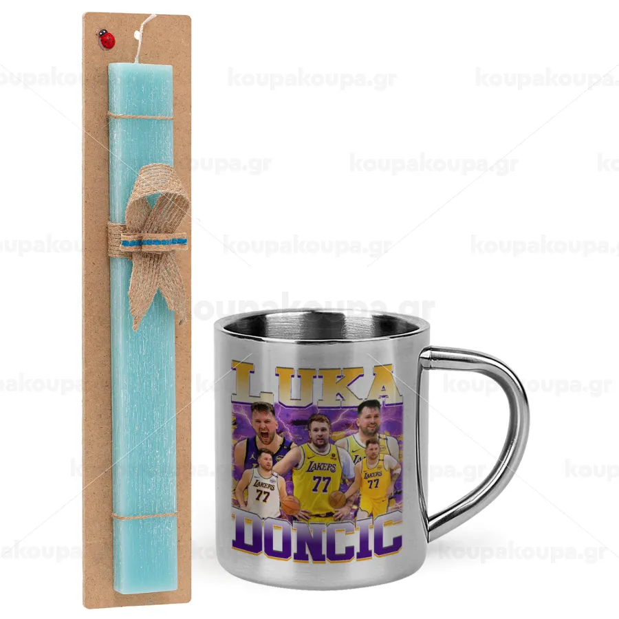 Luka Doncic Basketball , Easter Set, metallic thermal cup (300ml) & aromatic flat Easter candle (30cm) (TURQUOISE)