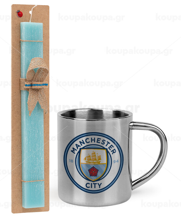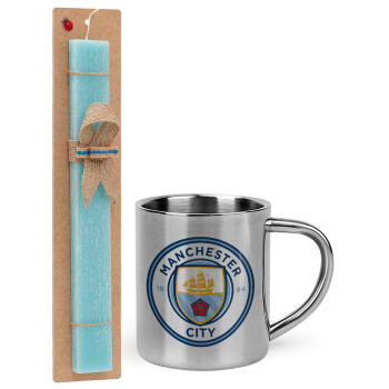 Manchester City FC , Easter Set, metallic thermal cup (300ml) & aromatic flat Easter candle (30cm) (TURQUOISE)