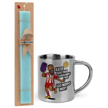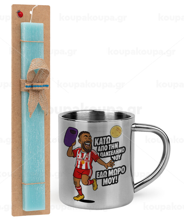 Ροντινέι, "ΚΑΤΩ ΑΠΟ ΤΗΝ ΠΑΝΣΕΛΗΝΟ ΜΟΥ!", Easter Set, metallic thermal cup (300ml) & aromatic flat Easter candle (30cm) (TURQUOISE)