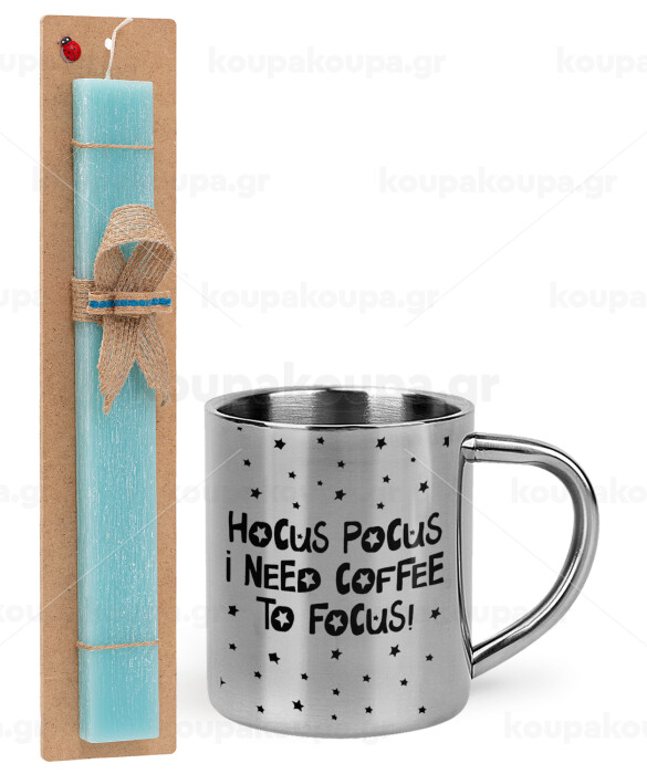 Hocus pocus i need coffee to focus - halloween, Easter Set, metallic thermal cup (300ml) & aromatic flat Easter candle (30cm) (TURQUOISE)