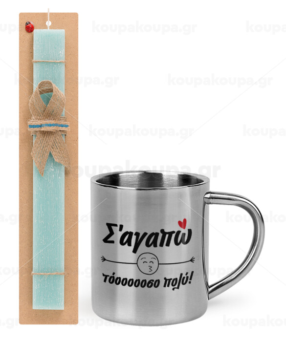 Σ΄ αγαπώ τόοοοοοσο πολύ!!!, Easter Set, metallic thermal cup (300ml) & aromatic flat Easter candle (30cm) (TURQUOISE)
