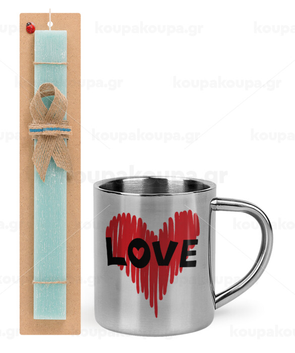 I Love You red heart, Easter Set, metallic thermal cup (300ml) & aromatic flat Easter candle (30cm) (TURQUOISE)