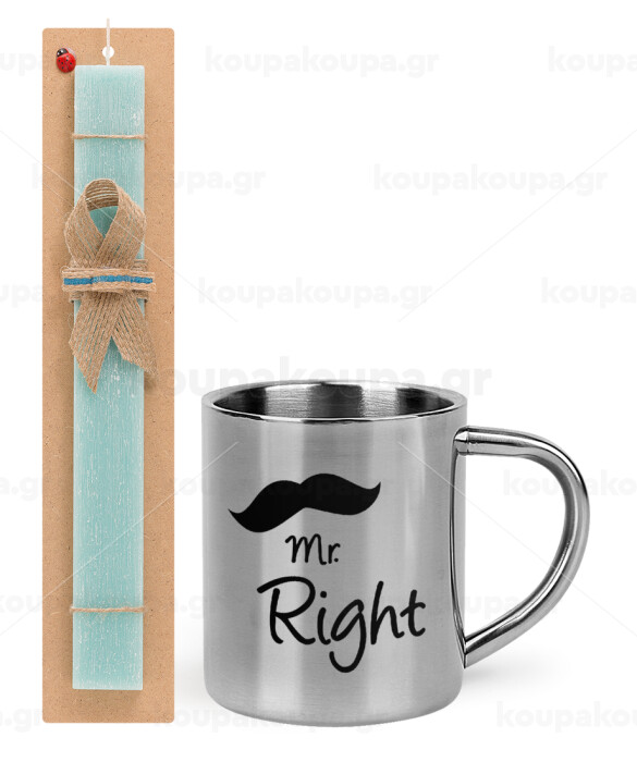 Mr right Mustache, Easter Set, metallic thermal cup (300ml) & aromatic flat Easter candle (30cm) (TURQUOISE)