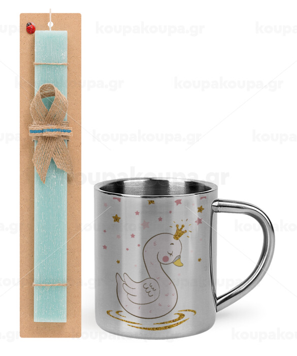 Crowned swan, Easter Set, metallic thermal cup (300ml) & aromatic flat Easter candle (30cm) (TURQUOISE)