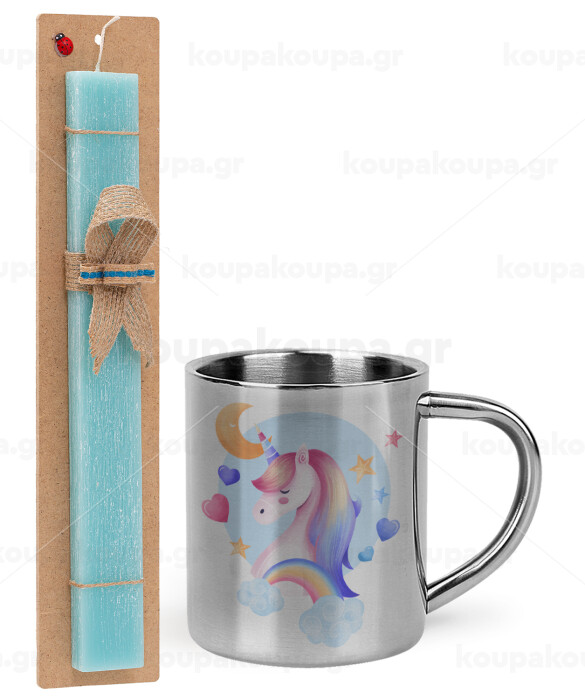 Cute unicorn, Easter Set, metallic thermal cup (300ml) & aromatic flat Easter candle (30cm) (TURQUOISE)
