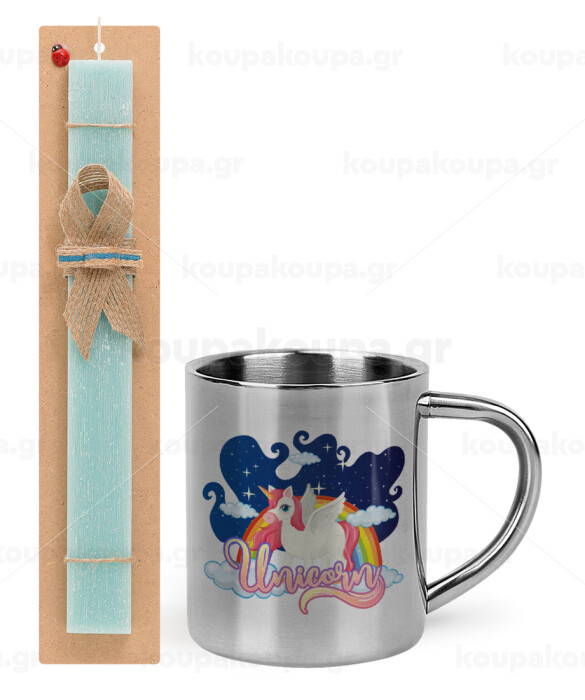 Μονόκερος, Easter Set, metallic thermal cup (300ml) & aromatic flat Easter candle (30cm) (TURQUOISE)