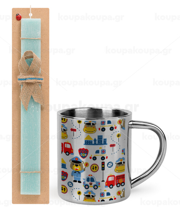 Rescue team cartoon, Easter Set, metallic thermal cup (300ml) & aromatic flat Easter candle (30cm) (TURQUOISE)