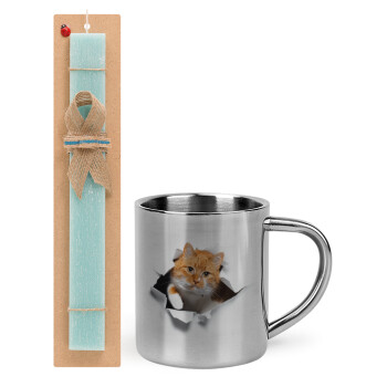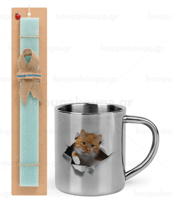 Cat cracked, Easter Set, metallic thermal cup (300ml) & aromatic flat Easter candle (30cm) (TURQUOISE)
