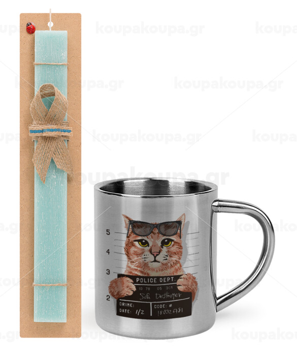 Cool cat, Easter Set, metallic thermal cup (300ml) & aromatic flat Easter candle (30cm) (TURQUOISE)