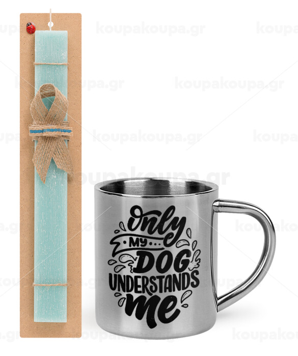 Only my DOG, understands me, Easter Set, metallic thermal cup (300ml) & aromatic flat Easter candle (30cm) (TURQUOISE)