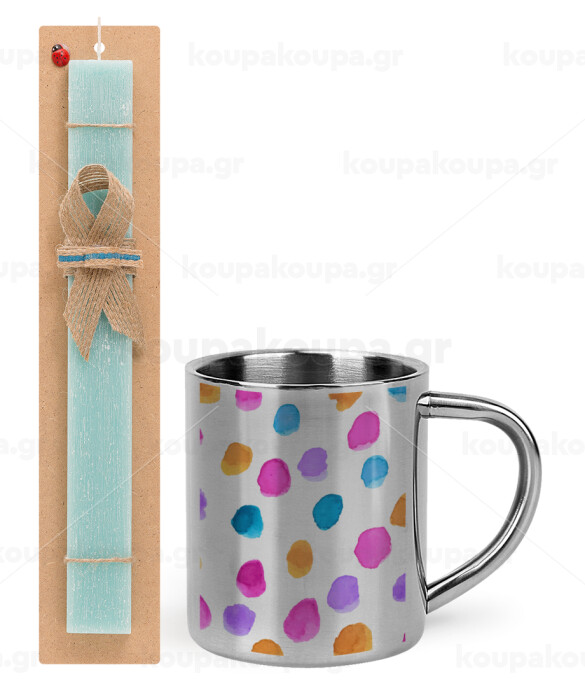 Watercolor dots, Easter Set, metallic thermal cup (300ml) & aromatic flat Easter candle (30cm) (TURQUOISE)