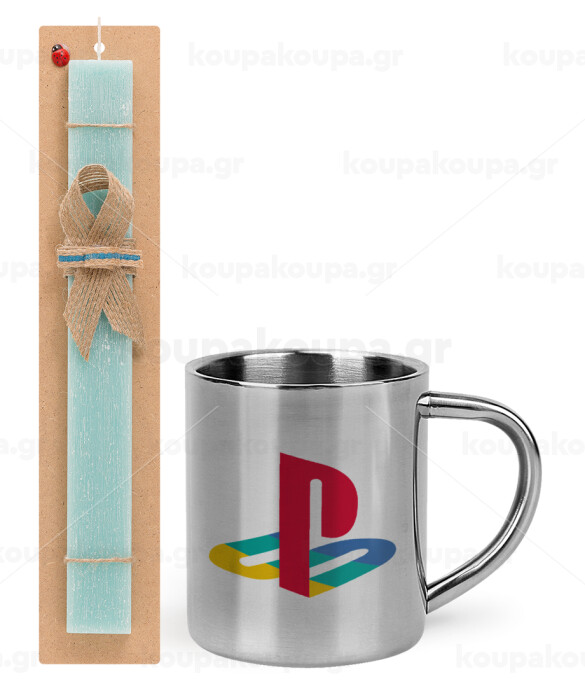 Playstation, Easter Set, metallic thermal cup (300ml) & aromatic flat Easter candle (30cm) (TURQUOISE)