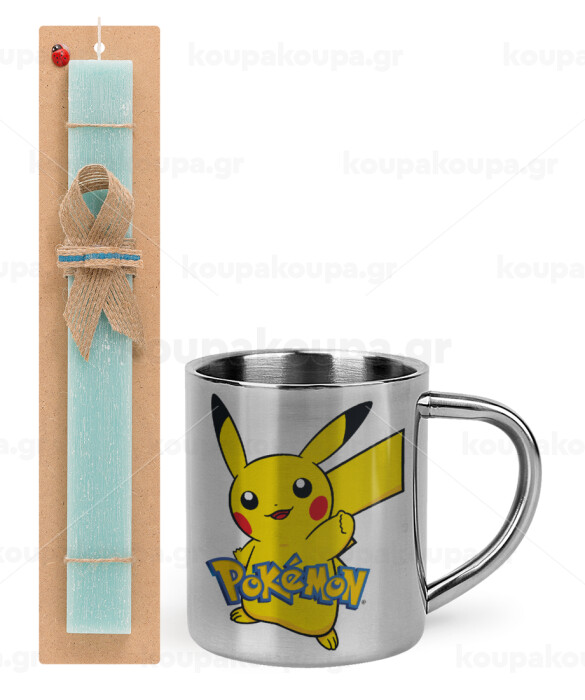 Pokemon pikachu, Easter Set, metallic thermal cup (300ml) & aromatic flat Easter candle (30cm) (TURQUOISE)