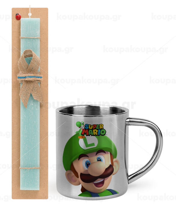 Super mario Luigi, Easter Set, metallic thermal cup (300ml) & aromatic flat Easter candle (30cm) (TURQUOISE)