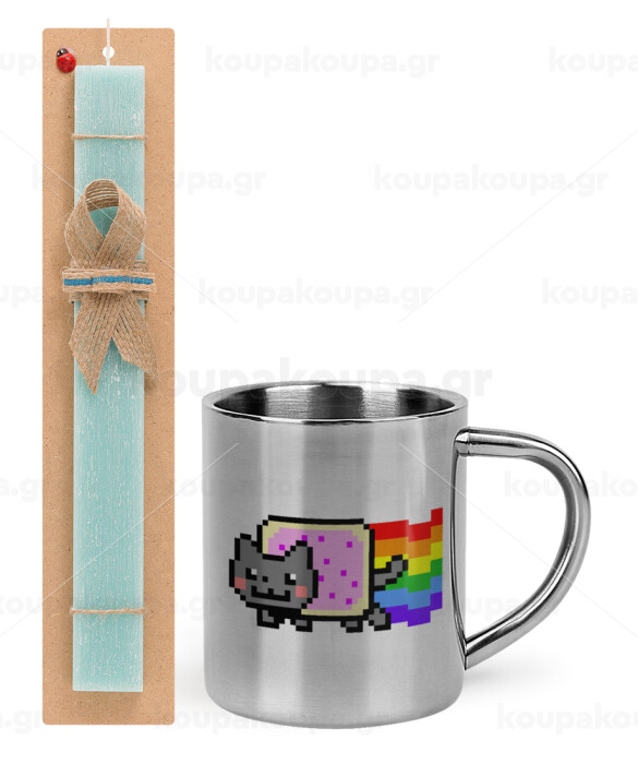 Nyan Pop-Tart Cat, Easter Set, metallic thermal cup (300ml) & aromatic flat Easter candle (30cm) (TURQUOISE)
