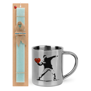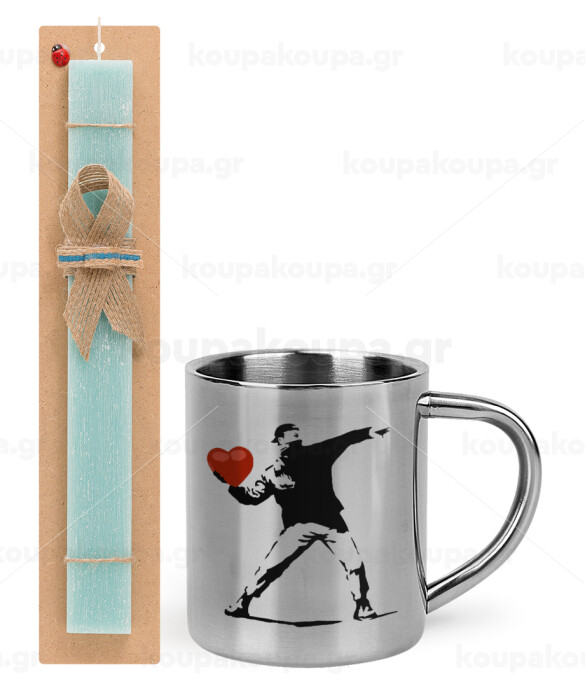 Banksy (The heart thrower), Easter Set, metallic thermal cup (300ml) & aromatic flat Easter candle (30cm) (TURQUOISE)