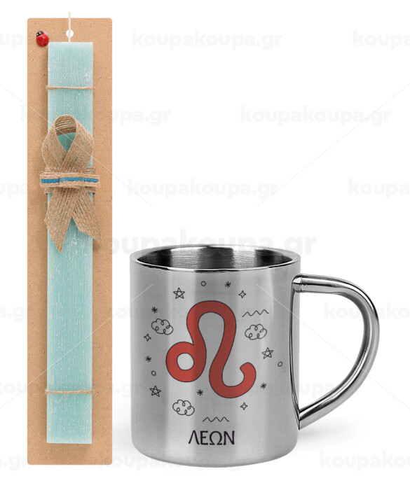 Ζώδια Λέων, Easter Set, metallic thermal cup (300ml) & aromatic flat Easter candle (30cm) (TURQUOISE)