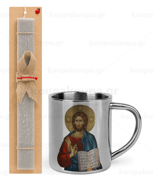 Jesus, Easter Set, metallic thermal cup (300ml) & Easter aromatic flat candle (30cm) (GRAY)