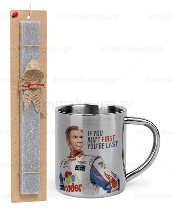 If You Ain't First You're Last Ricky Bobby, Talladega Nights, Easter Set, metallic thermal cup (300ml) & Easter aromatic flat candle (30cm) (GRAY)