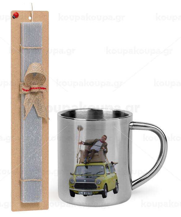 Mr. Bean mini 1000, Easter Set, metallic thermal cup (300ml) & Easter aromatic flat candle (30cm) (GRAY)
