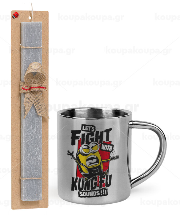Minions Let's fight with kung fu sounds, Easter Set, metallic thermal cup (300ml) & Easter aromatic flat candle (30cm) (GRAY)