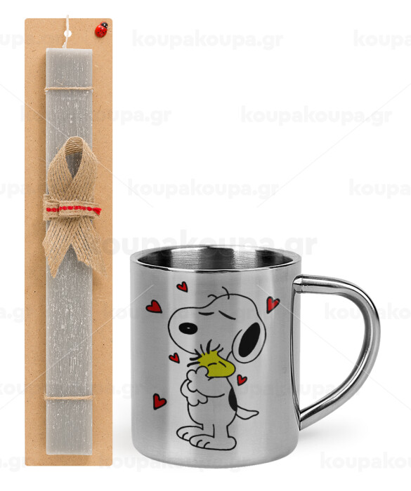Snoopy Love, Easter Set, metallic thermal cup (300ml) & Easter aromatic flat candle (30cm) (GRAY)