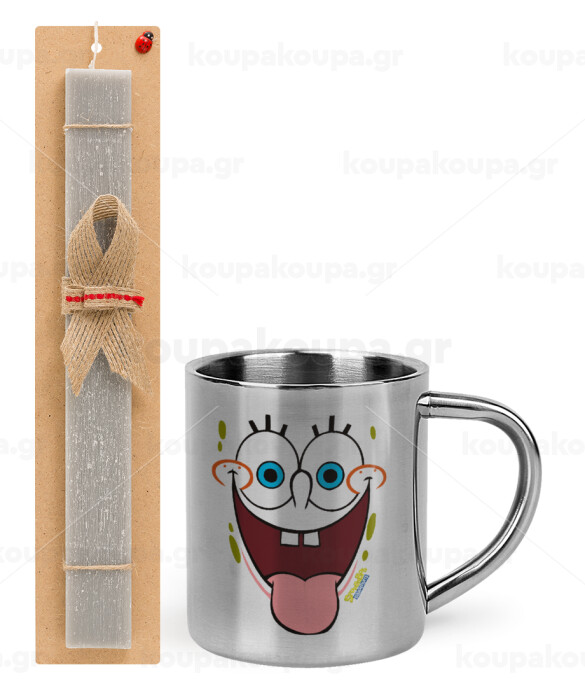 SpongeBob SquarePants smile, Easter Set, metallic thermal cup (300ml) & Easter aromatic flat candle (30cm) (GRAY)