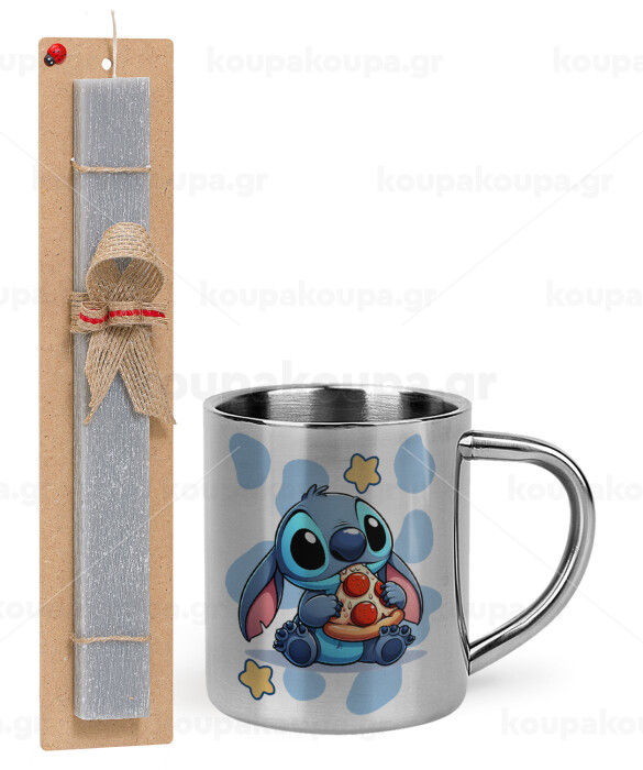 Stitch Pizza, Easter Set, metallic thermal cup (300ml) & Easter aromatic flat candle (30cm) (GRAY)