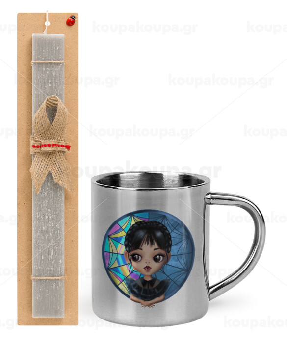 Wednesday big eyes, Easter Set, metallic thermal cup (300ml) & Easter aromatic flat candle (30cm) (GRAY)