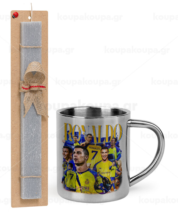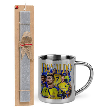 Cristiano Ronaldo Al Nassr, Easter Set, metallic thermal cup (300ml) & Easter aromatic flat candle (30cm) (GRAY)