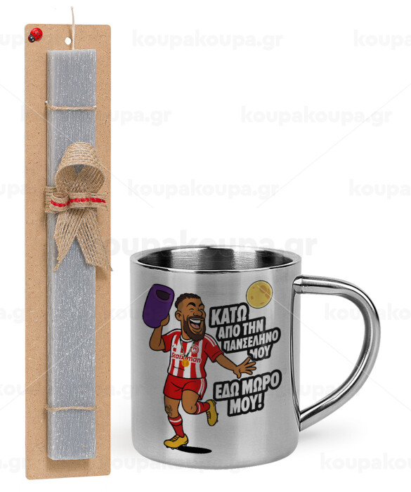 Ροντινέι, "ΚΑΤΩ ΑΠΟ ΤΗΝ ΠΑΝΣΕΛΗΝΟ ΜΟΥ!", Easter Set, metallic thermal cup (300ml) & Easter aromatic flat candle (30cm) (GRAY)