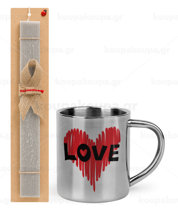I Love You red heart, Easter Set, metallic thermal cup (300ml) & Easter aromatic flat candle (30cm) (GRAY)
