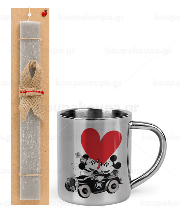 Mickey & Minnie love car, Easter Set, metallic thermal cup (300ml) & Easter aromatic flat candle (30cm) (GRAY)