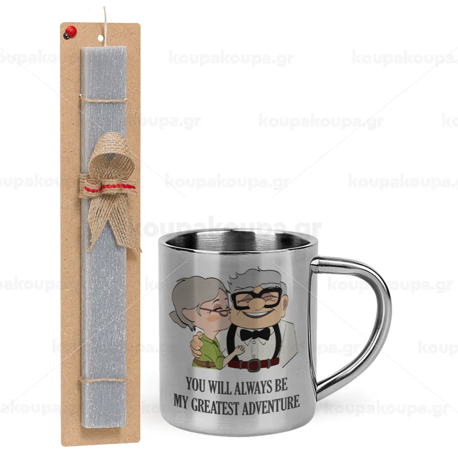 UP, YOU WILL ALWAYS BE MY GREATEST ADVENTURE, Easter Set, metallic thermal cup (300ml) & Easter aromatic flat candle (30cm) (GRAY)