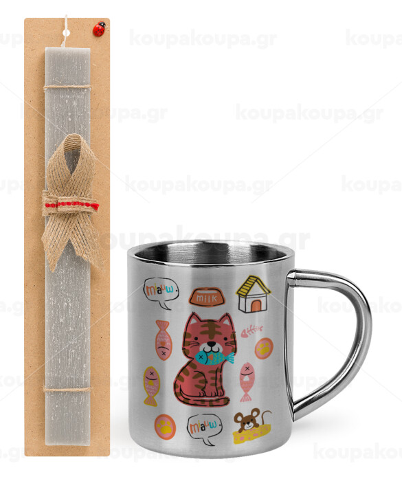 Cats and Fishes, Easter Set, metallic thermal cup (300ml) & Easter aromatic flat candle (30cm) (GRAY)
