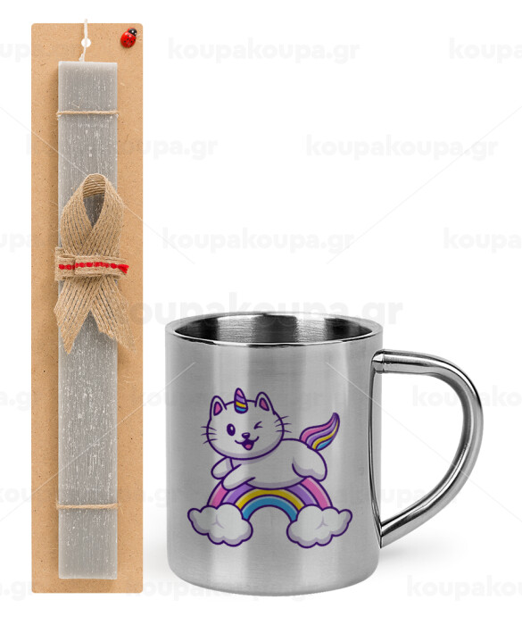 Cute cat unicorn, Easter Set, metallic thermal cup (300ml) & Easter aromatic flat candle (30cm) (GRAY)