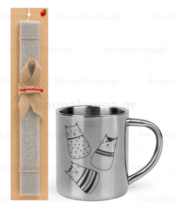 Cute cats, Easter Set, metallic thermal cup (300ml) & Easter aromatic flat candle (30cm) (GRAY)