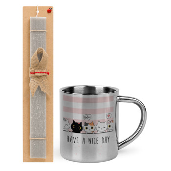 Have a nice day cats, Easter Set, metallic thermal cup (300ml) & Easter aromatic flat candle (30cm) (GRAY)