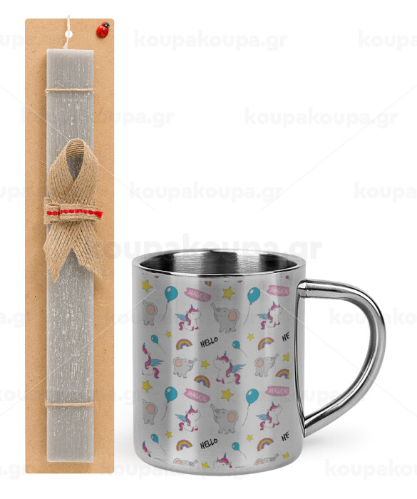 Happy Clouds Doodle, Easter Set, metallic thermal cup (300ml) & Easter aromatic flat candle (30cm) (GRAY)